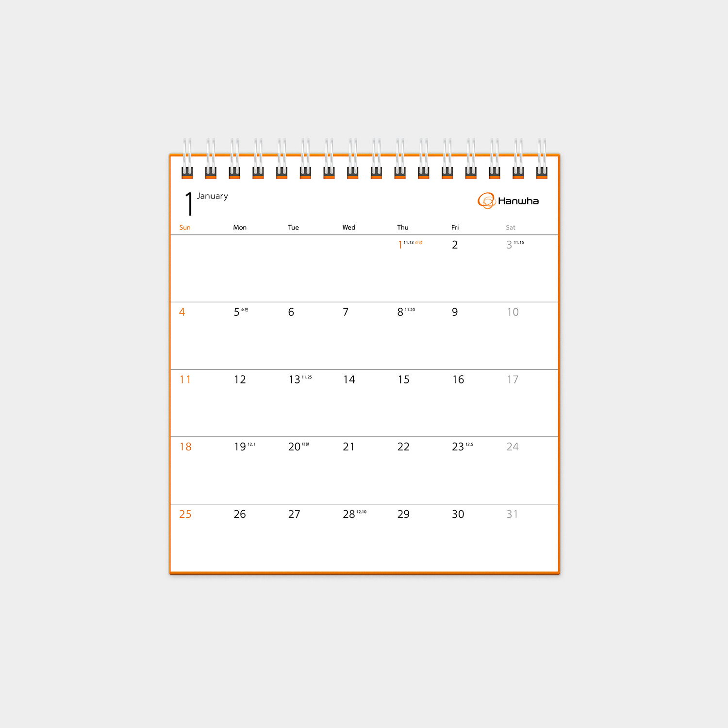 - 표지/ 전년도 12월 달력/ 월력/ 후년도 한 해의 달력 / 출장 중, 휴가 중 알림 순으로 구성
